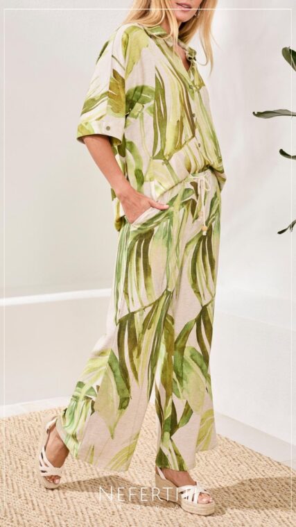 Pantalon ancho hojas Verde Beige PL5294