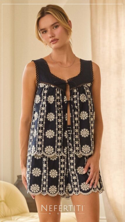 Conjunto bordado Blusa y pantalon corto Azul Marino D7355