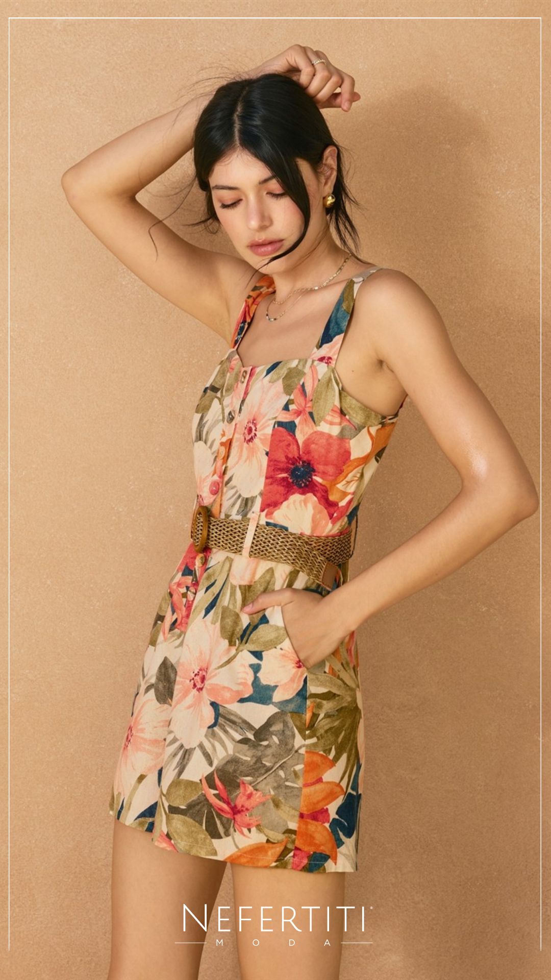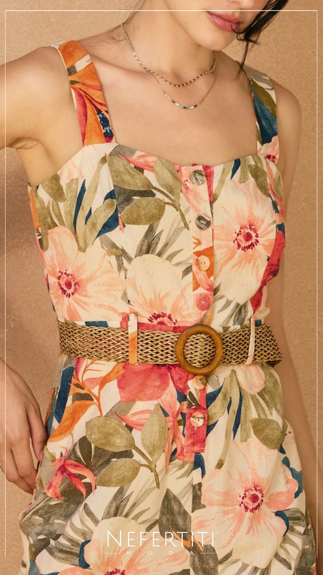 Enterizo corto tirante faja hojas Beige Naranja D7349