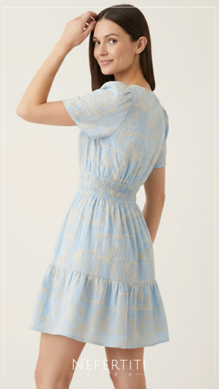 Vestido corto bordado manga corta Celeste Beige D7222