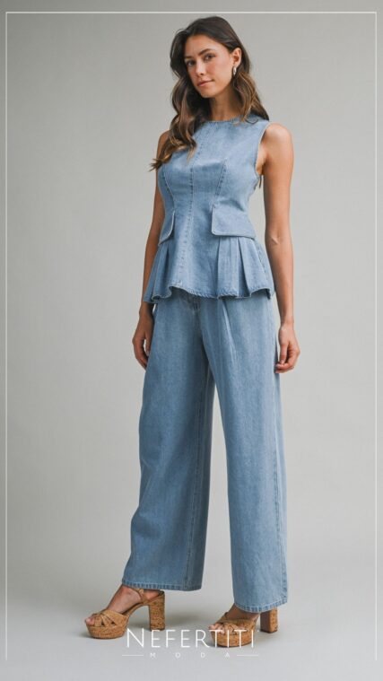 Conjunto blusa peplum mezclilla y pantalon largo D7310