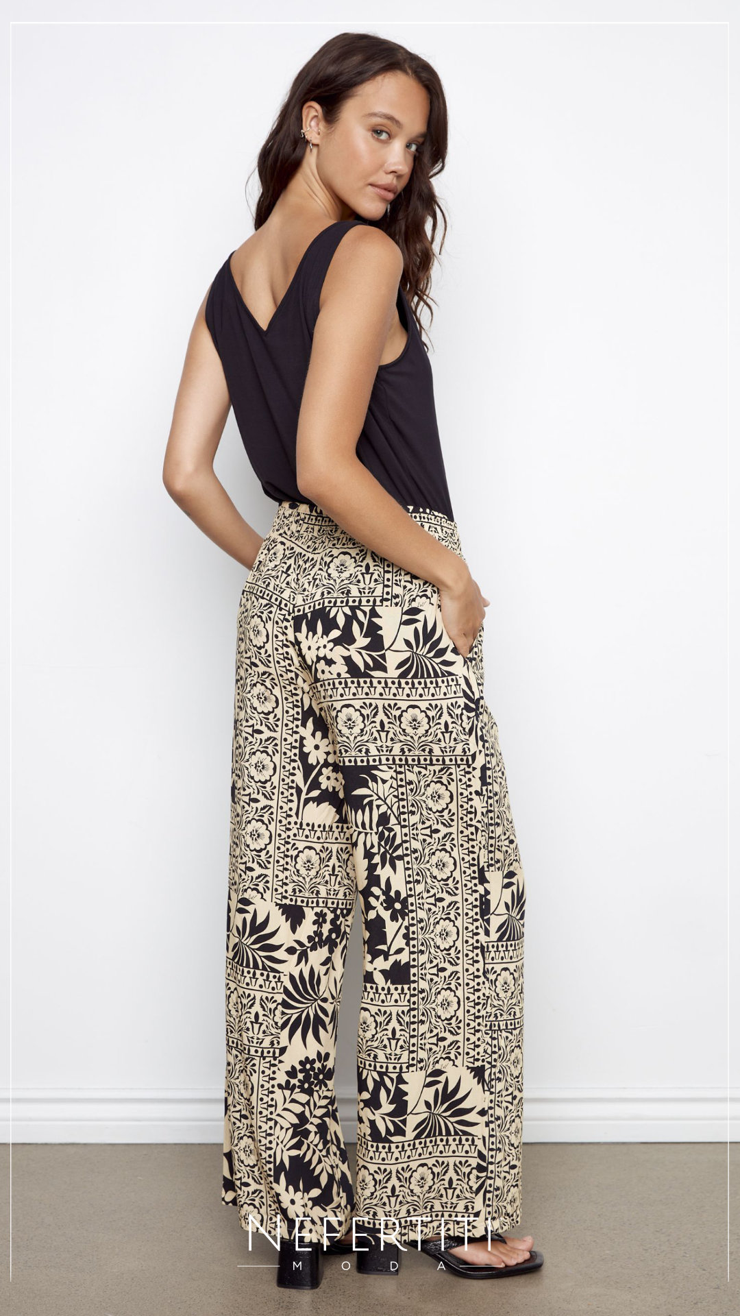 Pantalon ancho flores Negro Beige PL5144