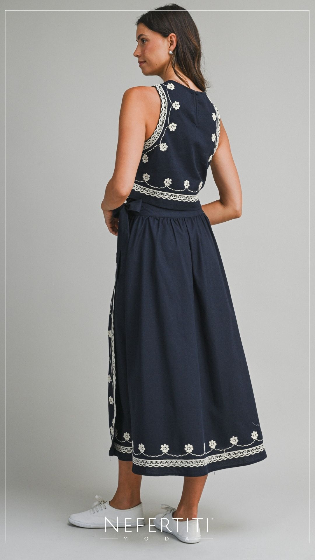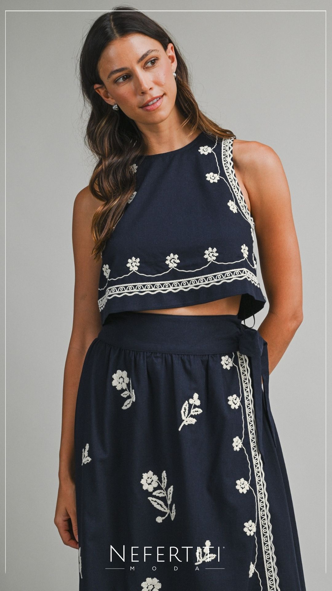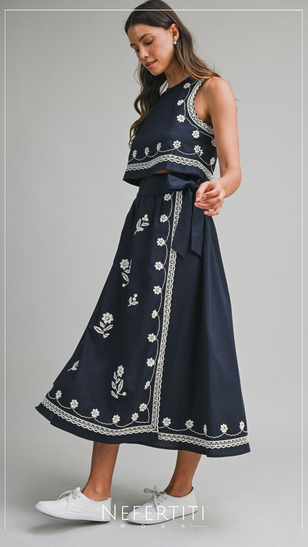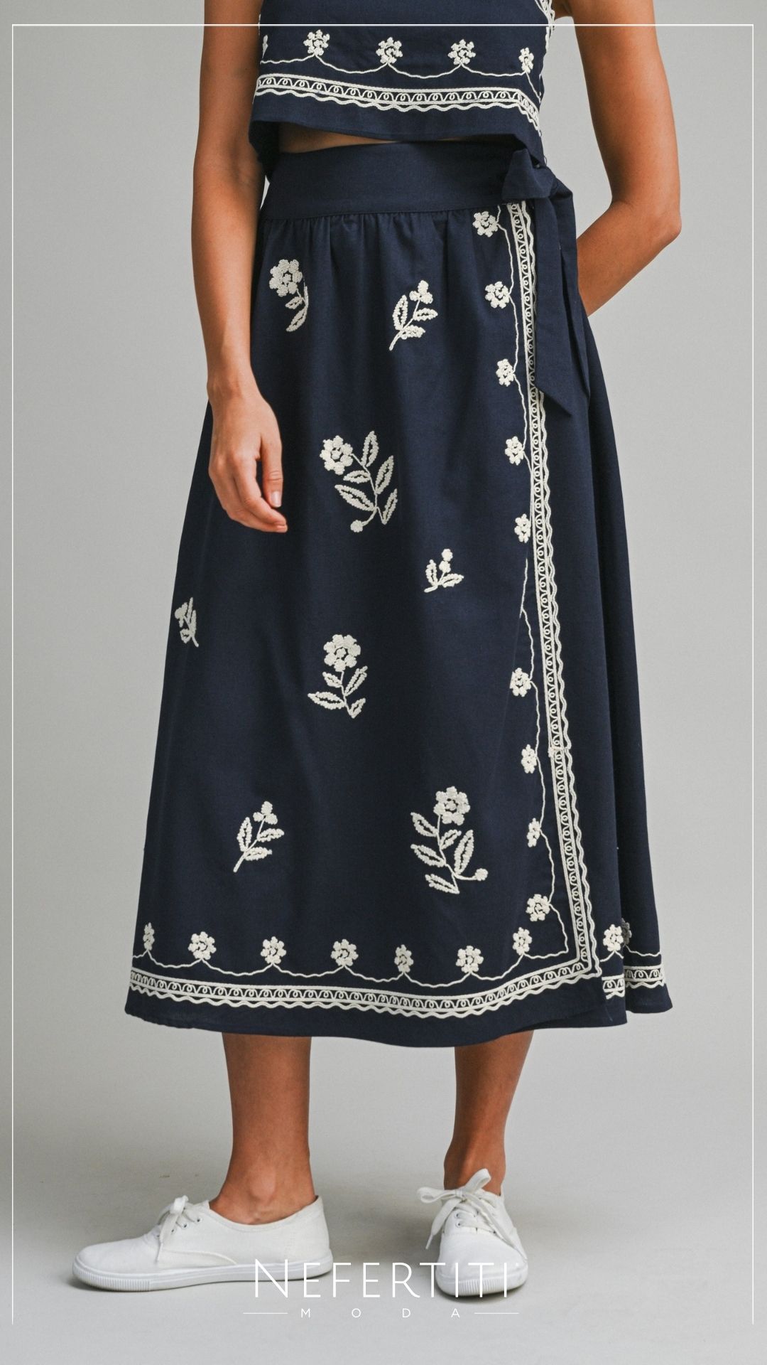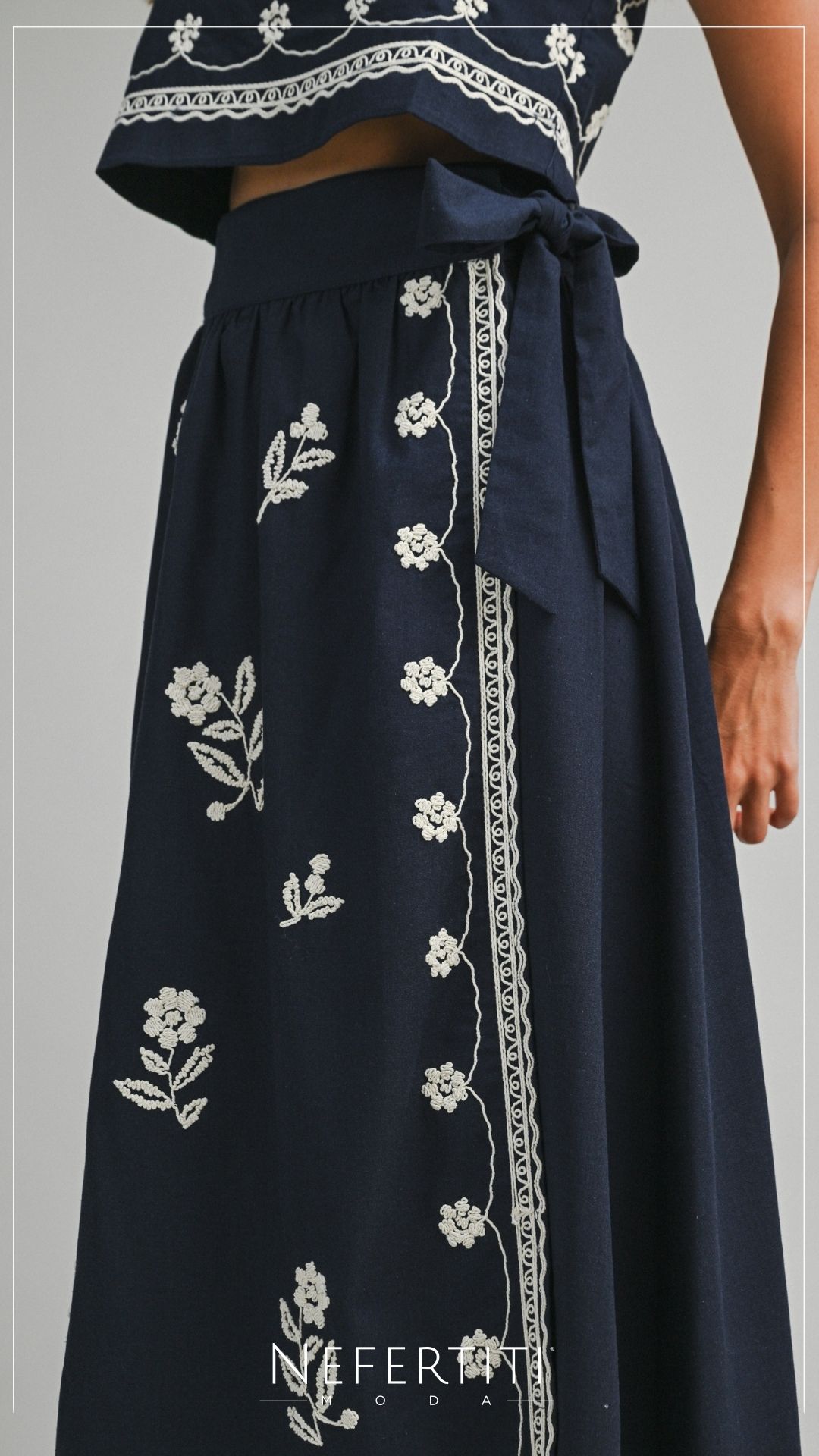 Conjunto blusa y falda midi bordado Azul Marino D7307