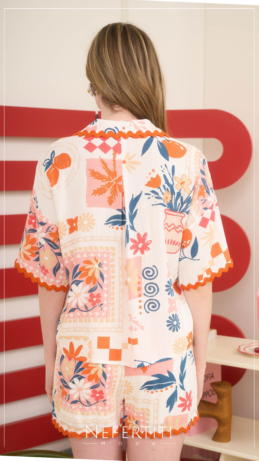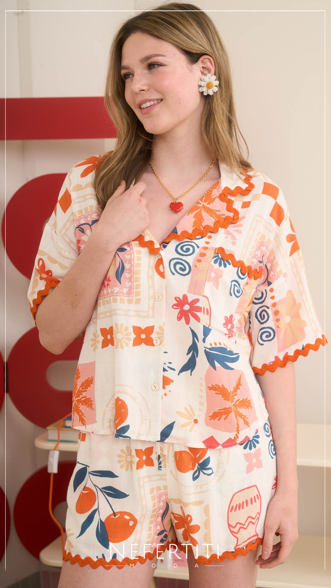 Conjunto blusa y pantalon corto flores fruta Naranja D6910