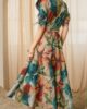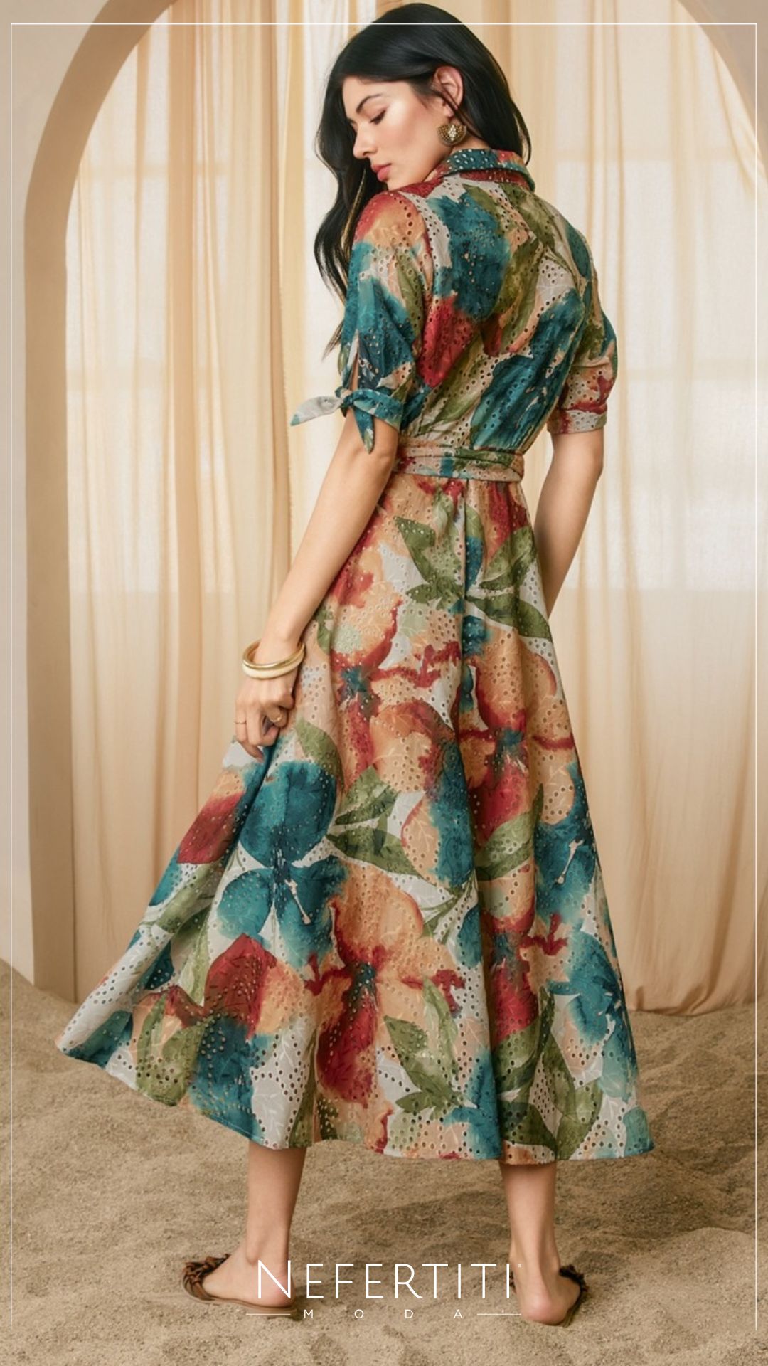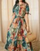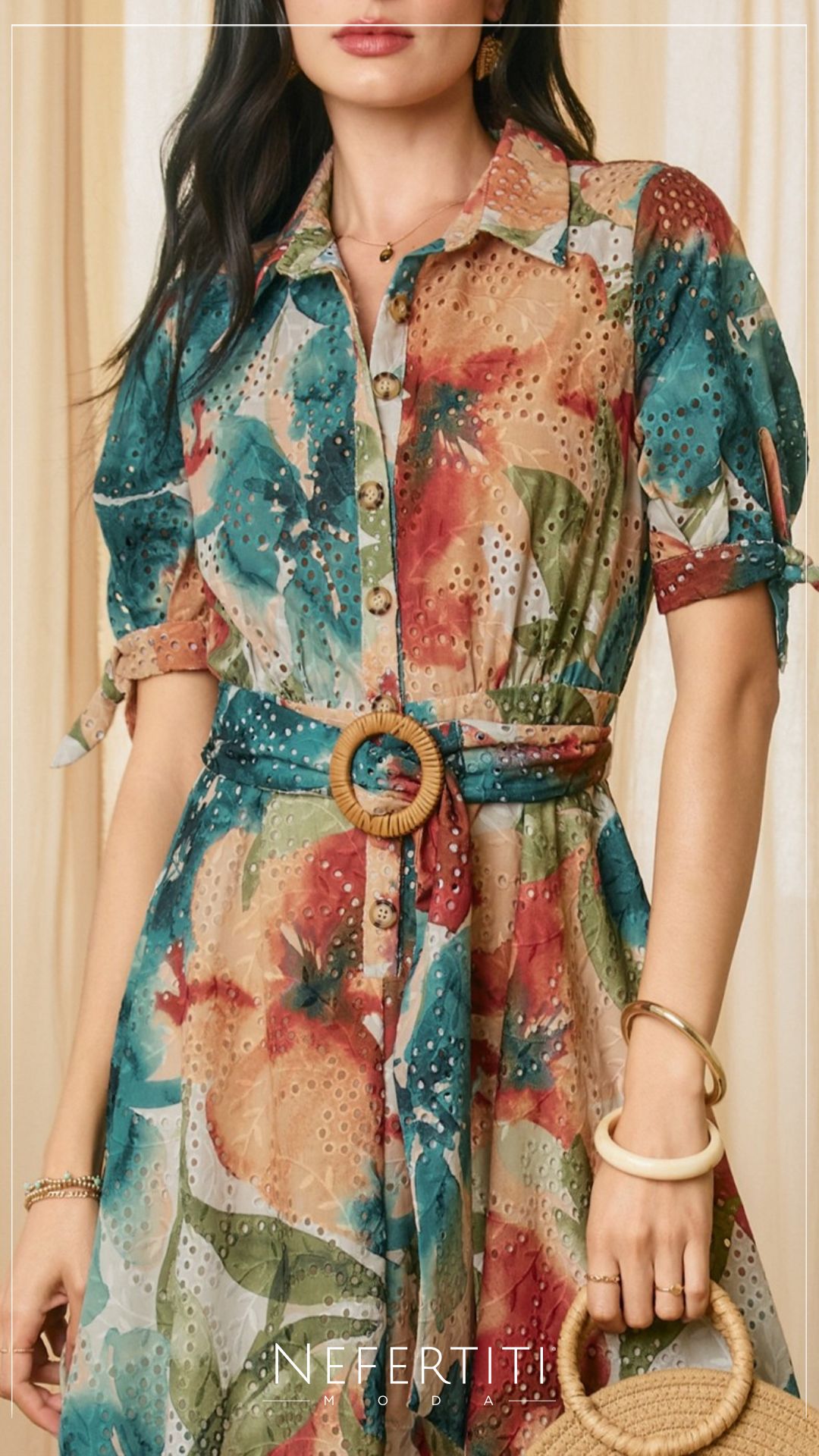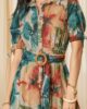 Vestido manga corta botones hojas Azul Verde Beige D7233